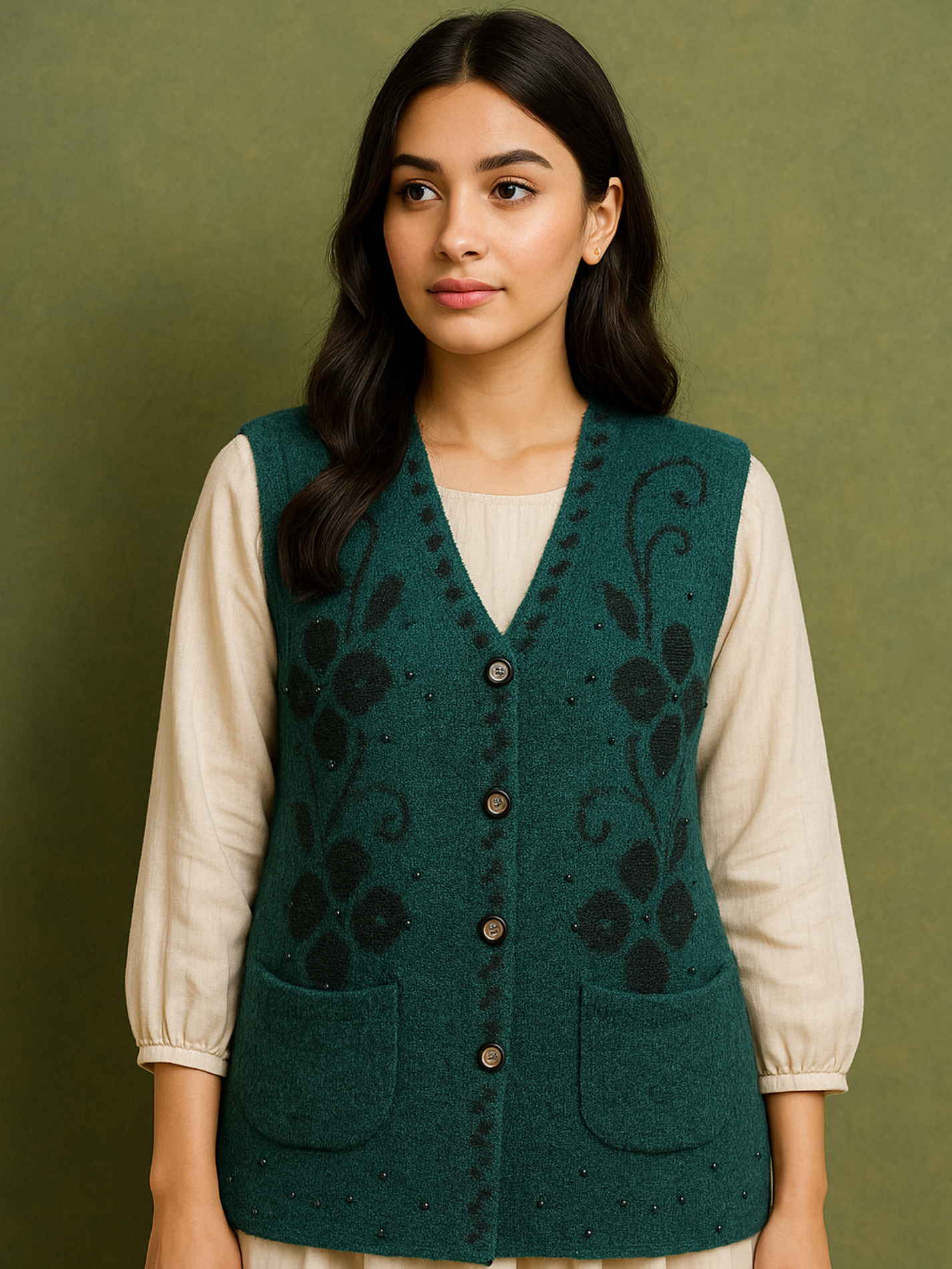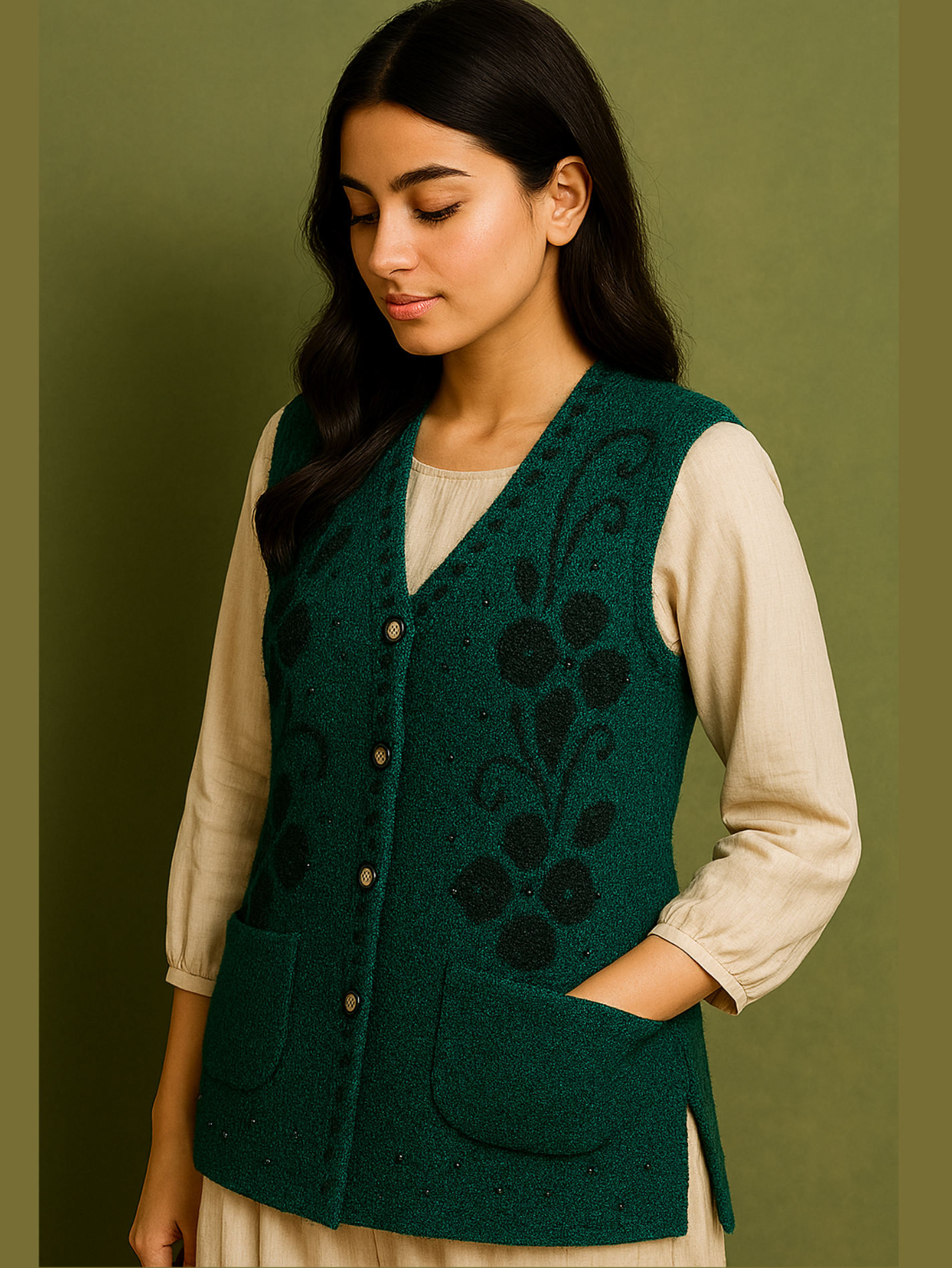 Bring elegance and warmth to your winter wardrobe with our Emerald Green Wool-Blend Floral Waistcoat. Designed with intricate black floral embroidery and delicate bead accents, this sleeveless piece offers both comfort and sophistication. The premium wool-blend fabric keeps you warm while remaining breathable, and the gold-tone buttons add a refined finish. Perfect for layering over kurtas, sweaters, or dresses for casual days or festive occasions.
