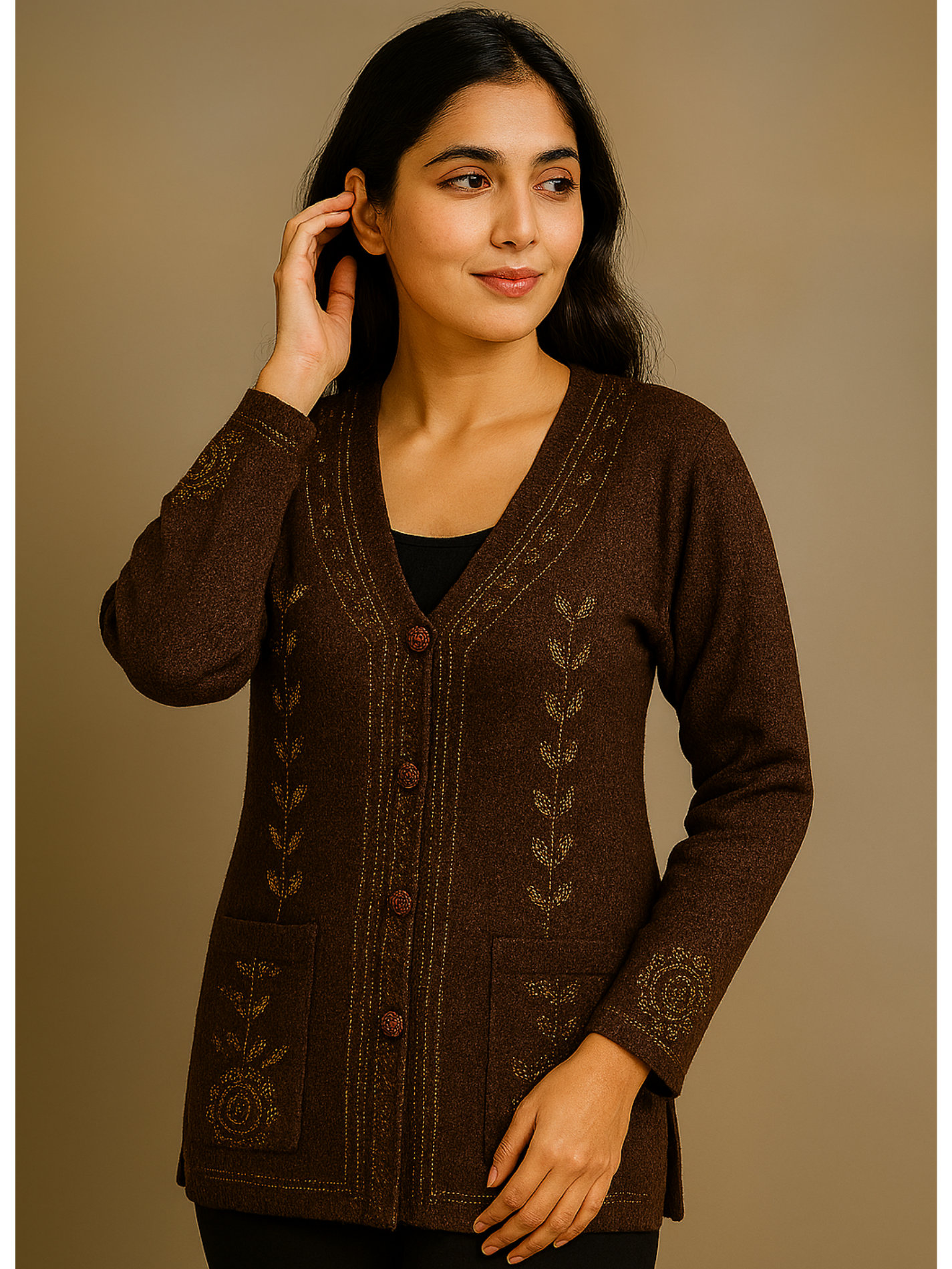 Embrace timeless elegance with our Deep Mocha Wool-Blend Cardigan, designed to keep you warm while adding a refined touch to your winter outfits. Crafted from soft, premium wool-blend fabric, this cardigan showcases intricate golden embroidery along the neckline, sleeves, and front panels, creating a graceful and versatile look suitable for both casual and dressy occasions. Its flattering cut and cozy texture make it a must-have for the season.