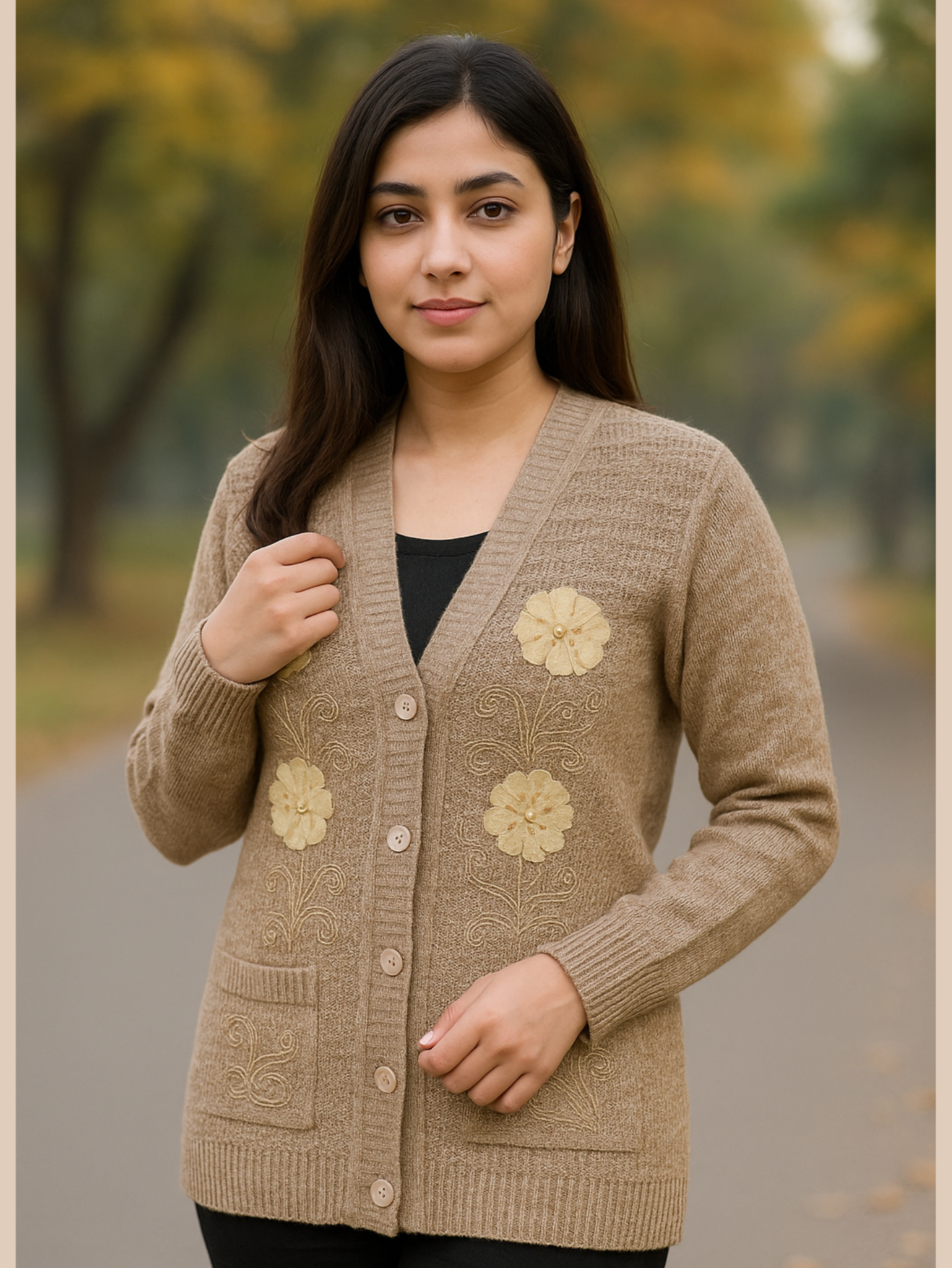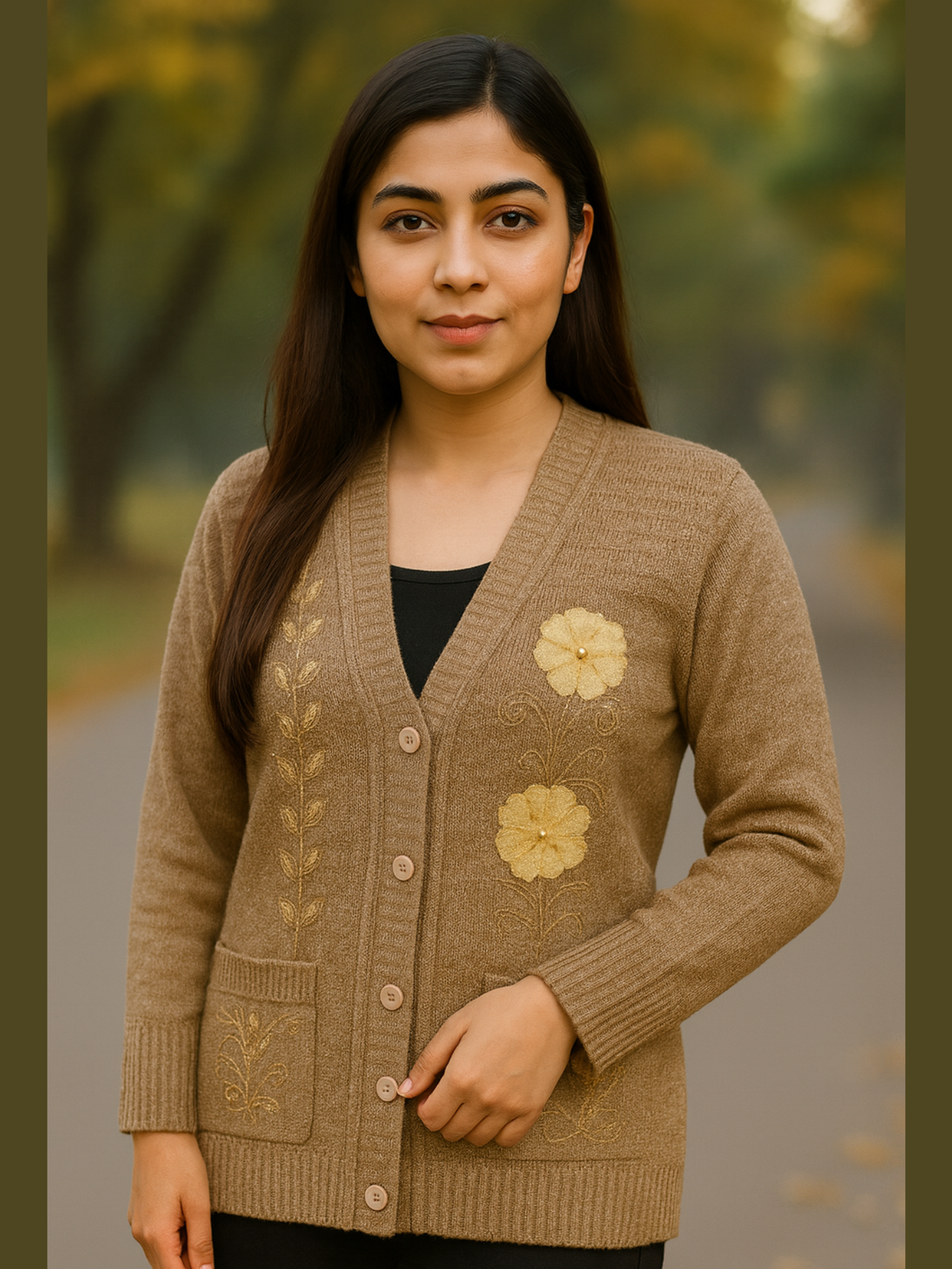 Elegant Camel Brown Wool Cardigan | Floral Embroidery & Full Sleeves