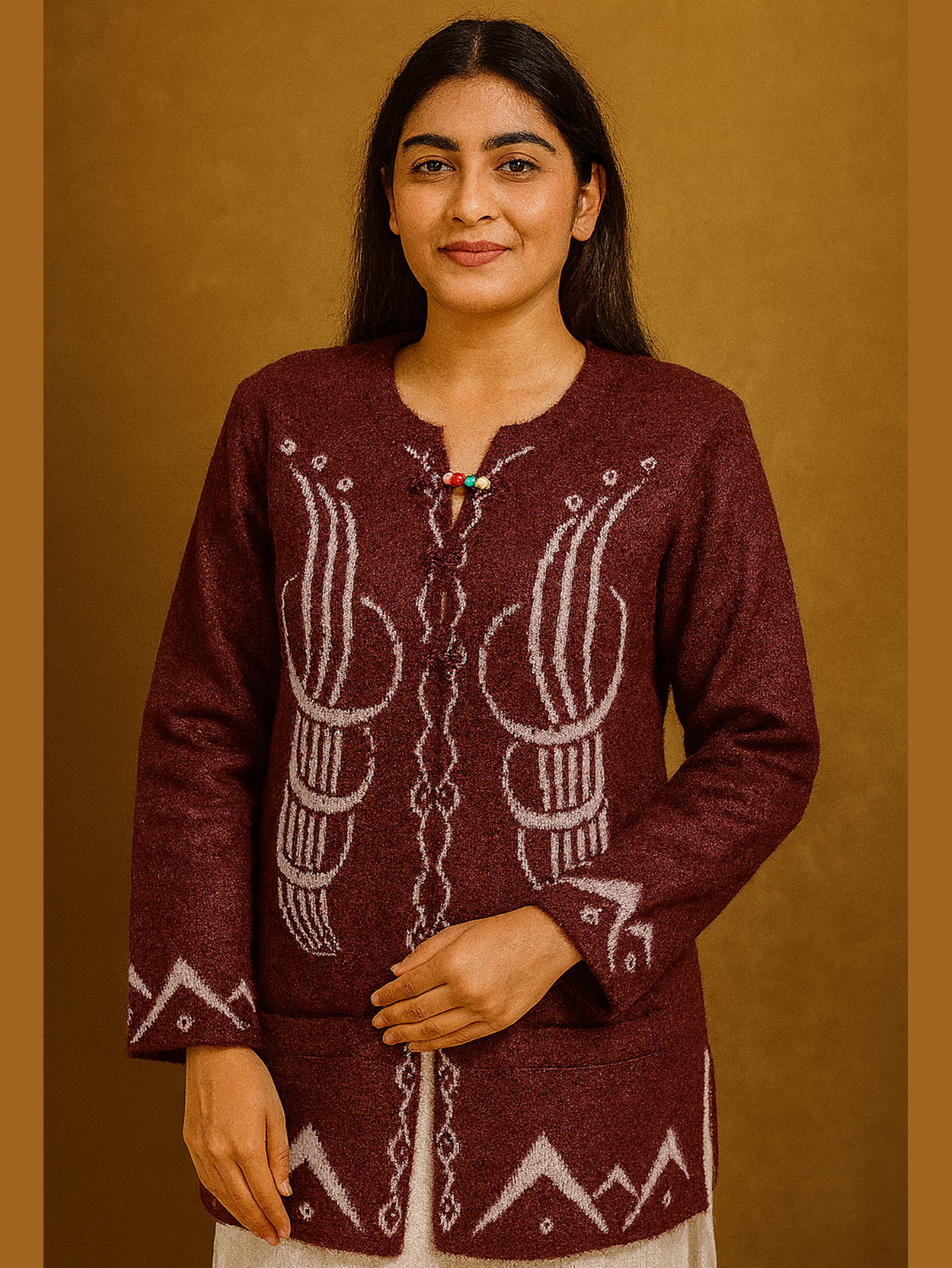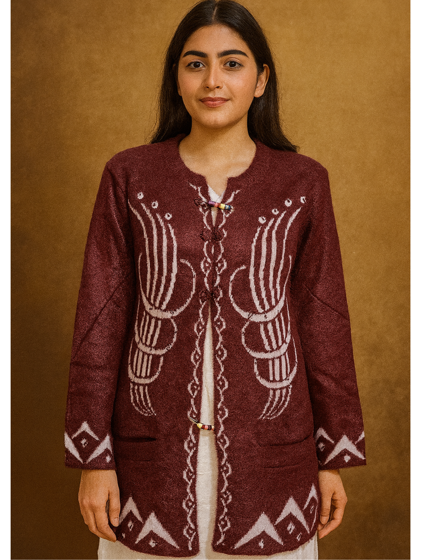 Elegant Maroon Woolen Sweater – White Embroidery & Beaded Closure
