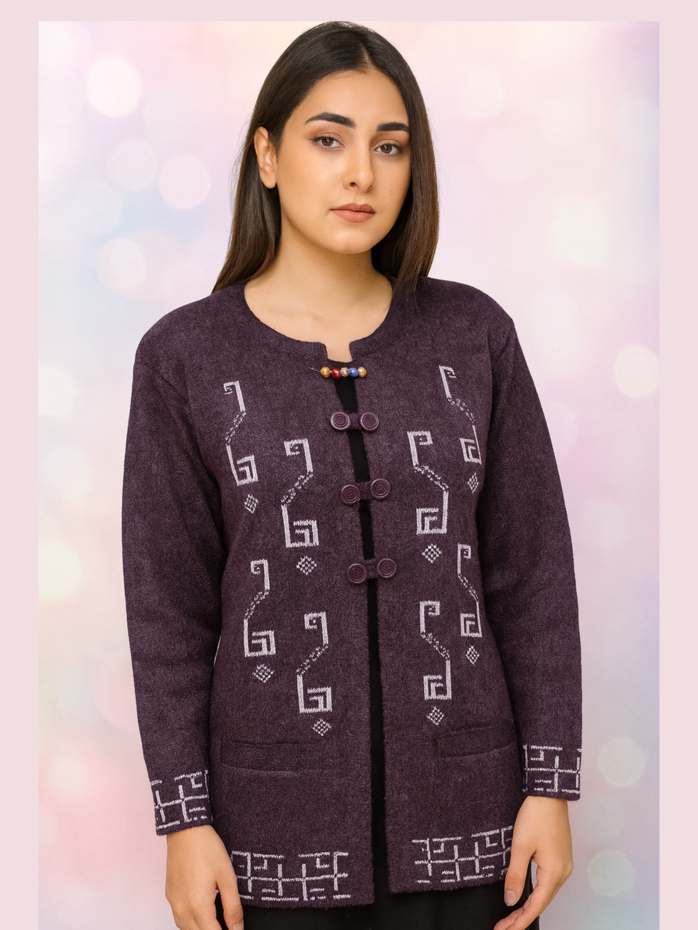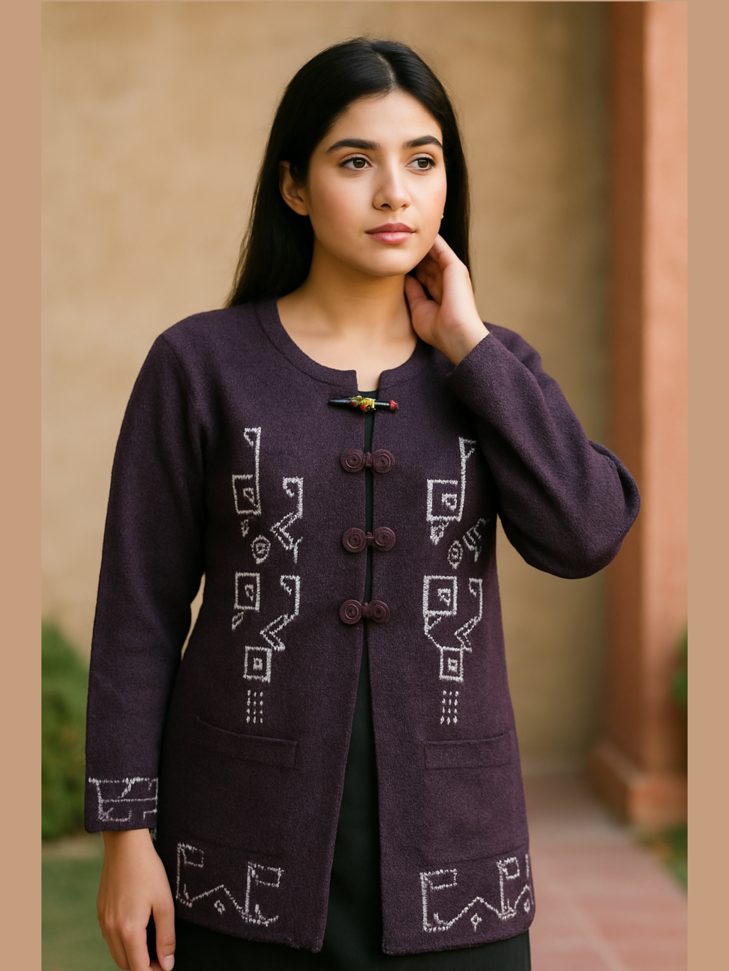 Embroidered Woolen Jacket for Women | Front-Open Winter Wear in Elegant Purple